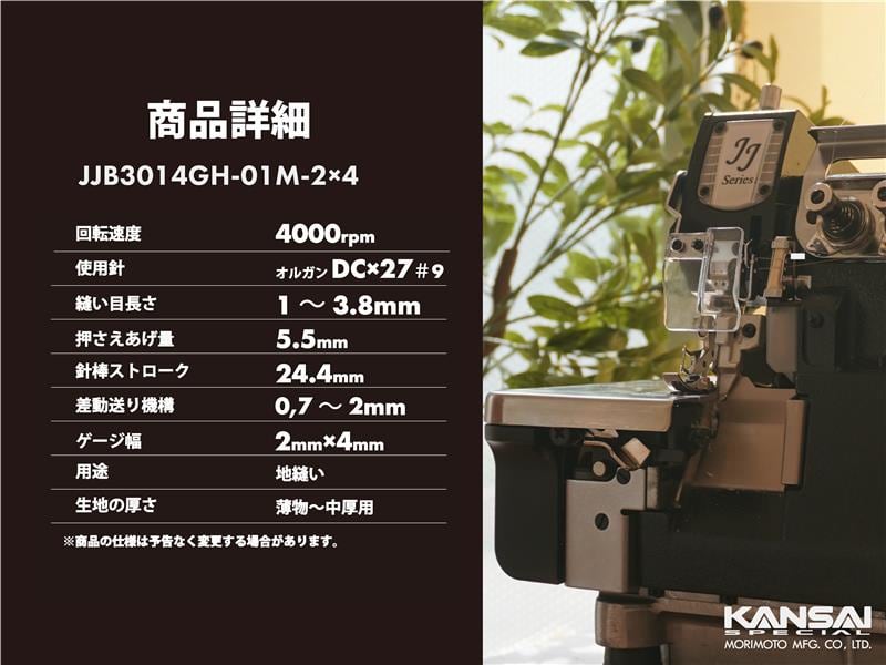 さらに、「JJB3014GH-01M-2×4(かがり幅2×4mmの2本針オーバーロックミシン)」は、インテリアになじむよう木製の専用台がセットされており、設置場所を制限しないため、店頭の省スペースや棚に置いて立ちミシンとしてもご使用いただけます。